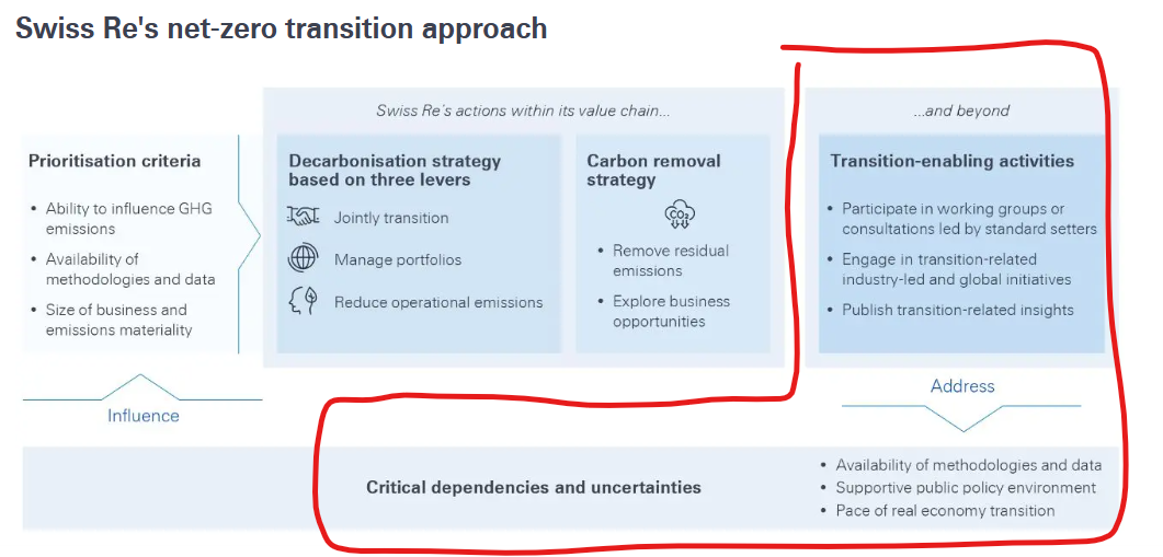 A couple of things distinguish this from your run-of-the-mill corporate sustainability slideware. First is the prominence given to external factors, here called “critical dependencies and uncertainties”. Swiss Re’s own actions remain front-and-centre, but it is also clear about its dependence on the external context. That’s refreshingly realistic.